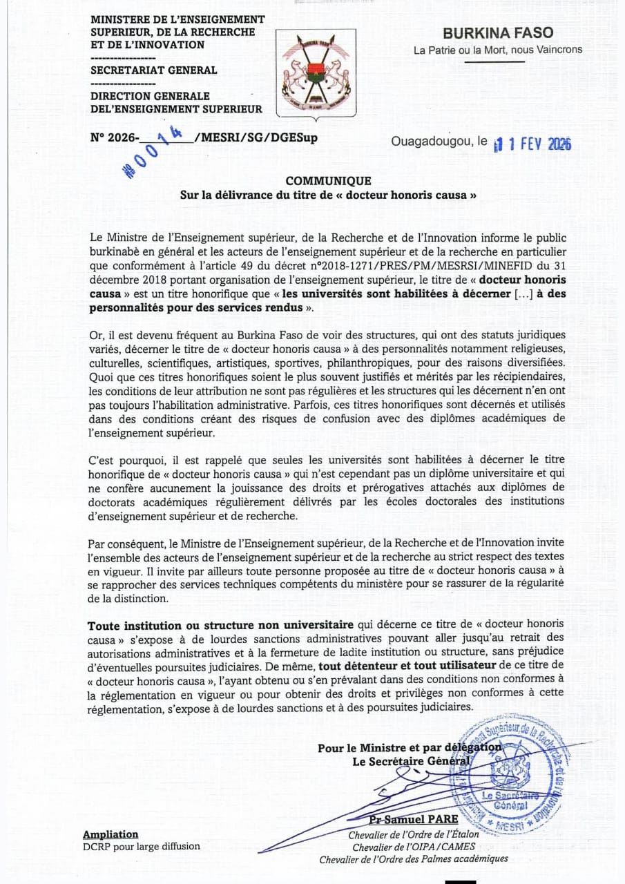 Annonces-Communiqués Titre de » Dr honoris causa » : le communiqué du ministère qui dit tout ! Réveil info 11 février 2026 Continue Reading Previous Previous post: Problème de gaz butane à Ouagadougou : le bon boulot de la police municipale Laisser un commentaire Annuler la réponseVotre adresse e-mail ne sera pas publiée. Les champs obligatoires sont indiqués avec *Commentaire * Nom * E-mail * Site web Enregistrer mon nom, mon e-mail et mon site dans le navigateur pour mon prochain commentaire. Articles connexes Région du Guiriko : des établissements sanitaires privés fermés ( la liste ) 11 février 2026 Annonce-14 février : le rendez-vous à ne pas manquer 11 février 2026