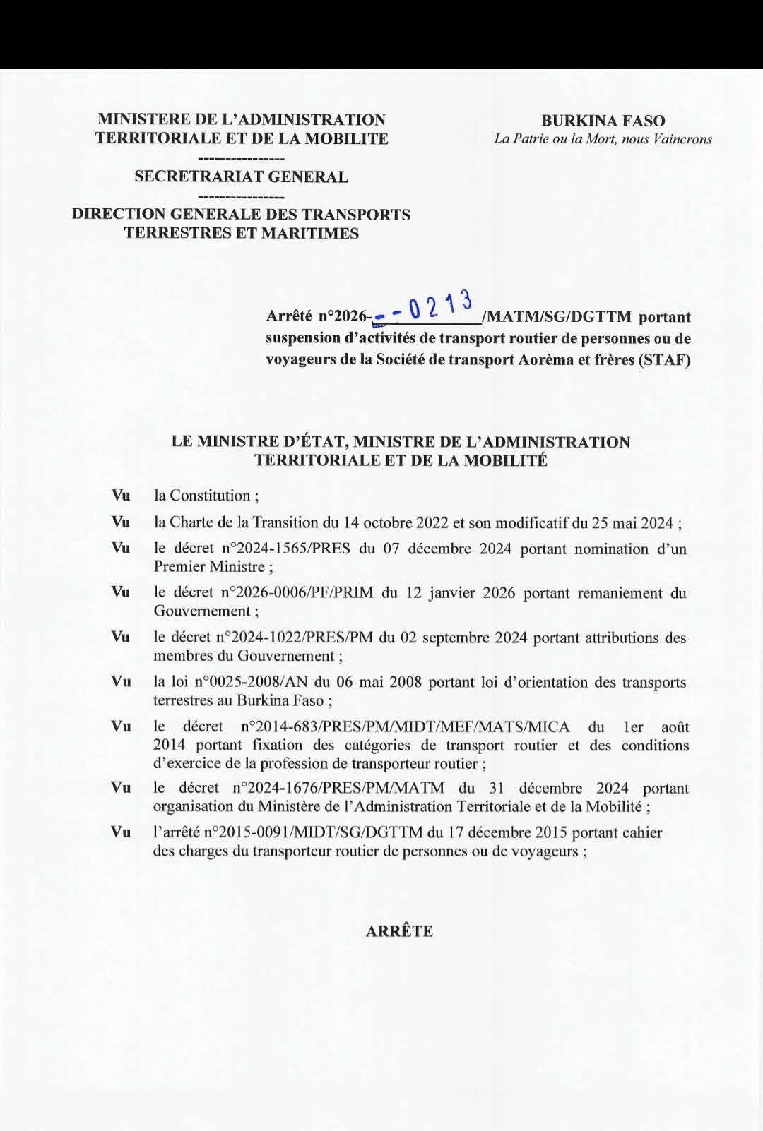 Actualité Société Burkina : les activités de la société de transport STAF suspendues – l’arrêté du ministère Réveil info 12 février 2026 Continue Reading Previous Previous post: Le député Malien après sa libération : c’est le président alassane qui m’a gracié et pris en charge mon billet retourNext Next post: Mali: la liste du nouveau gouvernement Laisser un commentaire Annuler la réponseVotre adresse e-mail ne sera pas publiée. Les champs obligatoires sont indiqués avec *Commentaire * Nom * E-mail * Site web Enregistrer mon nom, mon e-mail et mon site dans le navigateur pour mon prochain commentaire. Articles connexes Burkina : accident à Koumbia sur la RN1 12 février 2026 Burkina : le CSC et les Nations unies contre les discours de haine 12 février 2026