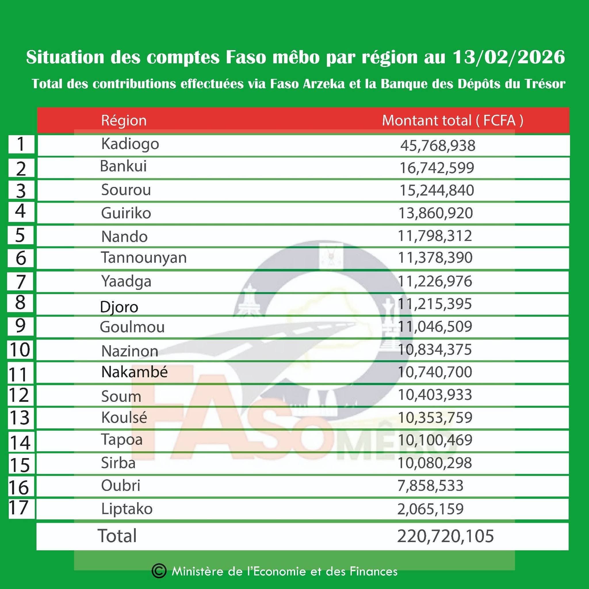 Actualité Annonces-Communiqués FASO MEBO : point des contributions par région Réveil info 17 février 2026 Continue Reading Previous Previous post: Congo Brazzaville: décès du ministre de la Fonction publiqueNext Next post: Affaire Kanis: démenti formel du DG Laisser un commentaire Annuler la réponseVotre adresse e-mail ne sera pas publiée. Les champs obligatoires sont indiqués avec *Commentaire * Nom * E-mail * Site web Enregistrer mon nom, mon e-mail et mon site dans le navigateur pour mon prochain commentaire. Articles connexes Accès aux produits de grande consommation et carême : Faso Yaar à la rescousse 18 février 2026 Mois de carême : « que dieu nous bénisse et éclaire chacun de nos pas », Dr Harouna Kaboré 18 février 2026