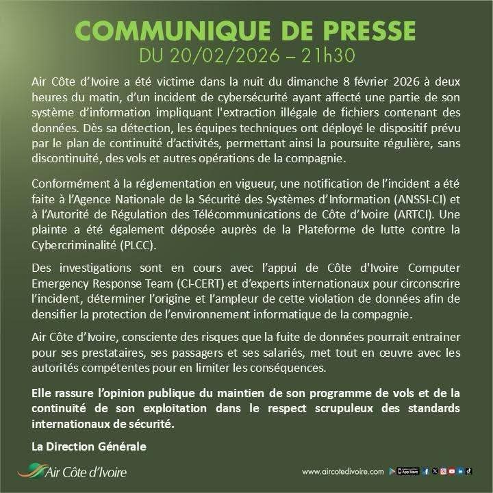 Conformément à la réglementation en vigueur, Air Côte d’Ivoire a notifié l’incident aux autorités compétentes, notamment à l’Agence Nationale de la Sécurité des Systèmes d’Information (ANSSI-CI) et à l’Autorité de Régulation des Télécommunications de Côte d’Ivoire (ARTCI). Une plainte a également été déposée auprès de la Plateforme de Lutte contre la Cybercriminalité (PLCC).