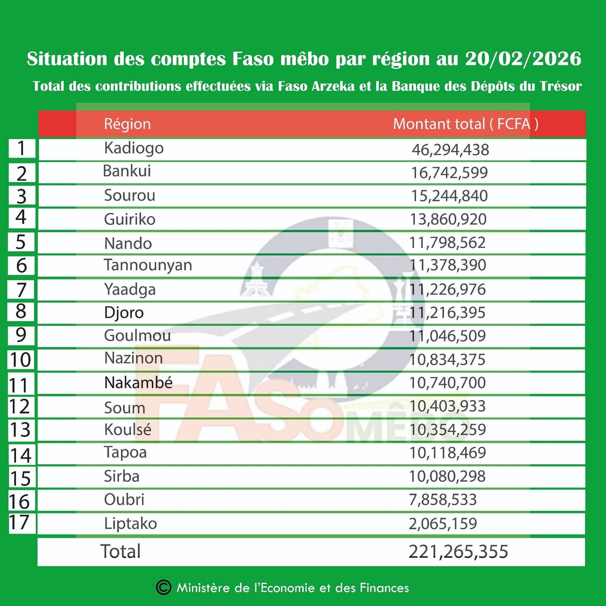 Actualité Annonces-Communiqués FASO MEBO : point des contributions par région à la date du 20 février 2026 Réveil info 21 février 2026 Continue Reading Previous Previous post: Sachets plastiques : bientôt des contrôlesNext Next post: Préparatifs de la SNC BOBO 2026: le ministre Pingdwendé sur le terrain Laisser un commentaire Annuler la réponseVotre adresse e-mail ne sera pas publiée. Les champs obligatoires sont indiqués avec *Commentaire * Nom * E-mail * Site web Enregistrer mon nom, mon e-mail et mon site dans le navigateur pour mon prochain commentaire. Articles connexes Niger : le ministre de la défense sur le terrain 21 février 2026 Cybercriminalité : 651 attestations dans 16 pays africains 21 février 2026
