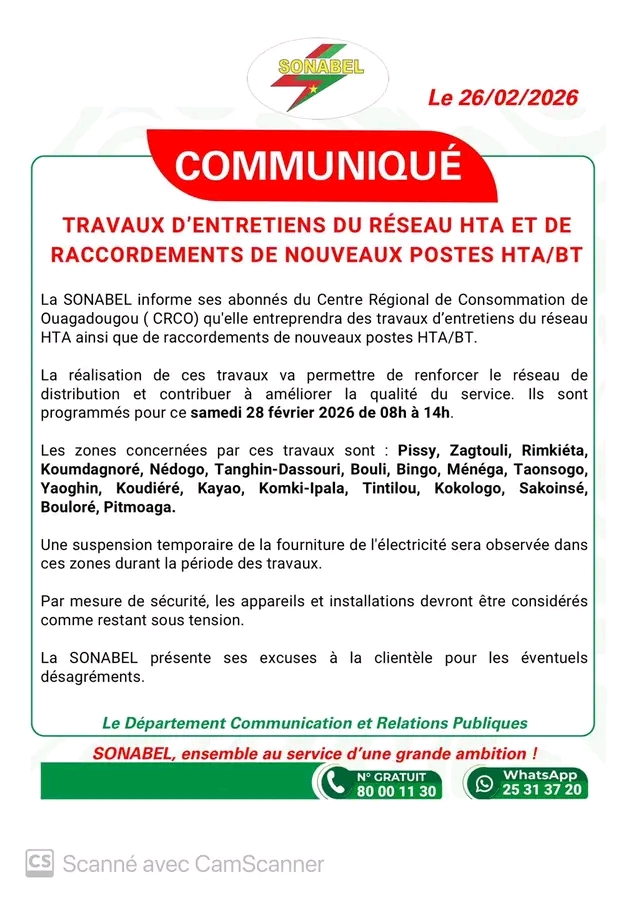 Annonces-Communiqués Communiqué : SONABEL Réveil info 26 février 2026 Continue Reading Previous Previous post: Gendarmerie nationale du Burkina Faso : A la découverte du nouveau Chef D’état-major…Next Next post: Procès Tiégnan 2: Ye Camille dit tout,le procureur aussi ! Laisser un commentaire Annuler la réponseVotre adresse e-mail ne sera pas publiée. Les champs obligatoires sont indiqués avec *Commentaire * Nom * E-mail * Site web Enregistrer mon nom, mon e-mail et mon site dans le navigateur pour mon prochain commentaire. Articles connexes Conseil des ministres : un médecin révoqué,un policier rétrogradé pour faits de corruption… 26 février 2026 Conseil des ministres ce jeudi 26 février 2026 26 février 2026