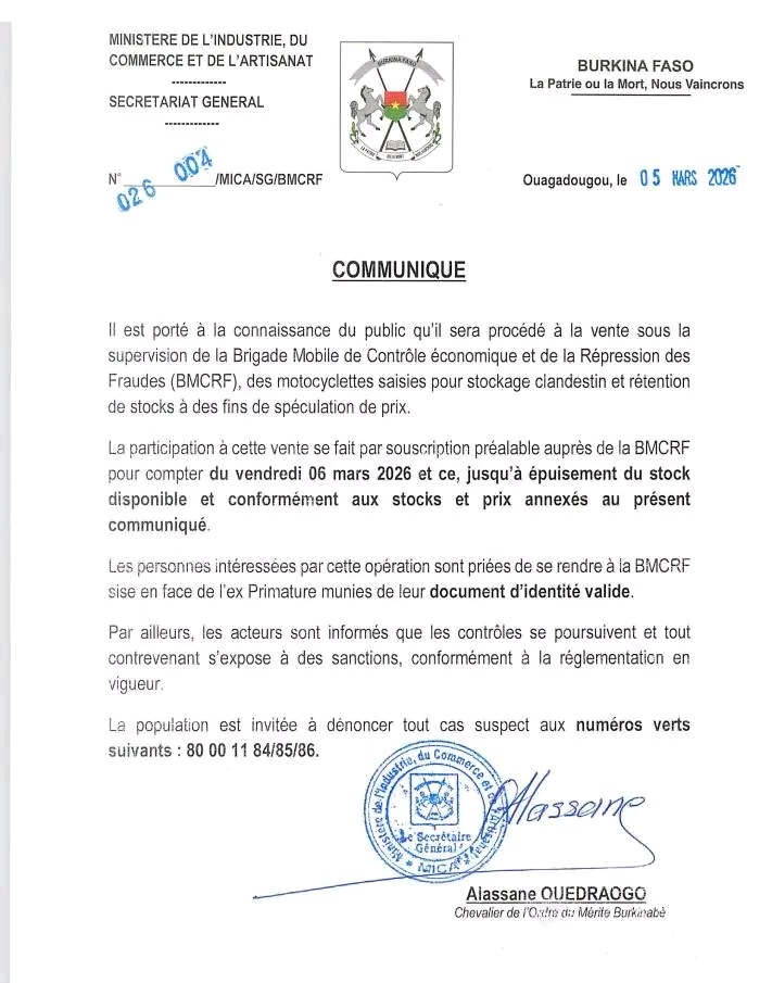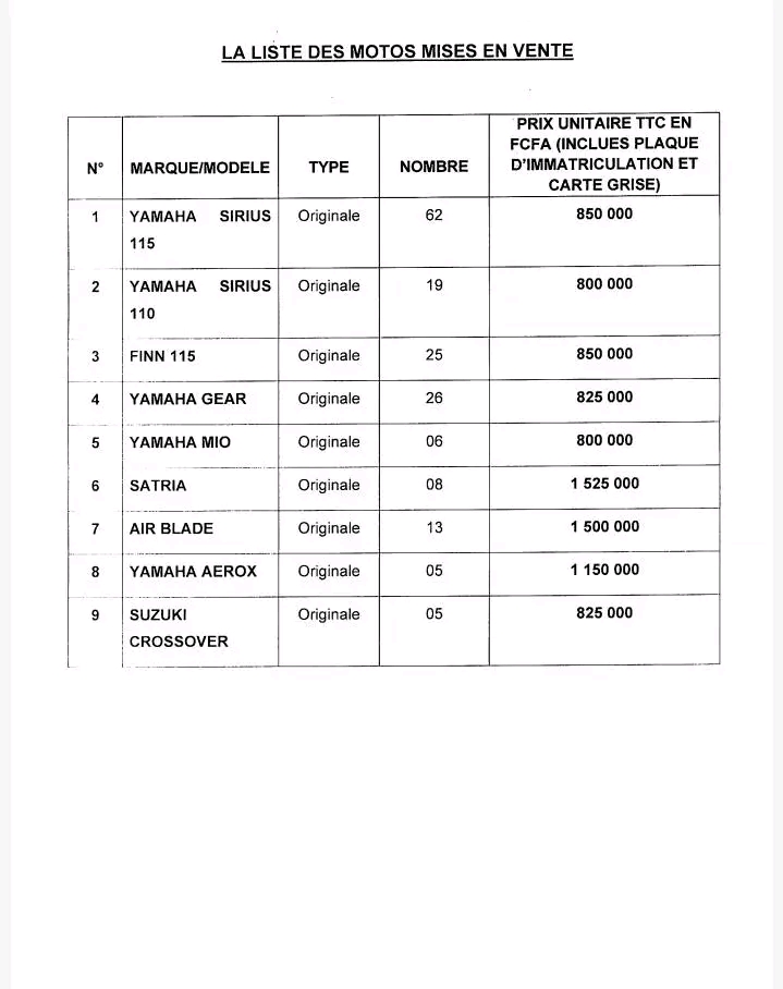 Il est porté à la connaissance du public qu’il sera procédé à la vente sous supervision de la Brigade Mobile de Contrôle économique et de la Répression des Fraudes (BMCRF), des motocyclettes saisies pour stockage clandestin et rétention de stocks à des fins de spéculation de prix.