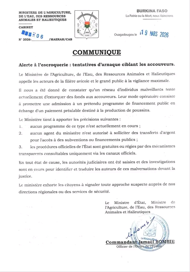 Le Ministère de l’Agriculture, de l’Eau, des Ressources animales et halieutiques appelle les acteurs de la filière avicole et le grand public à la vigilance maximale.