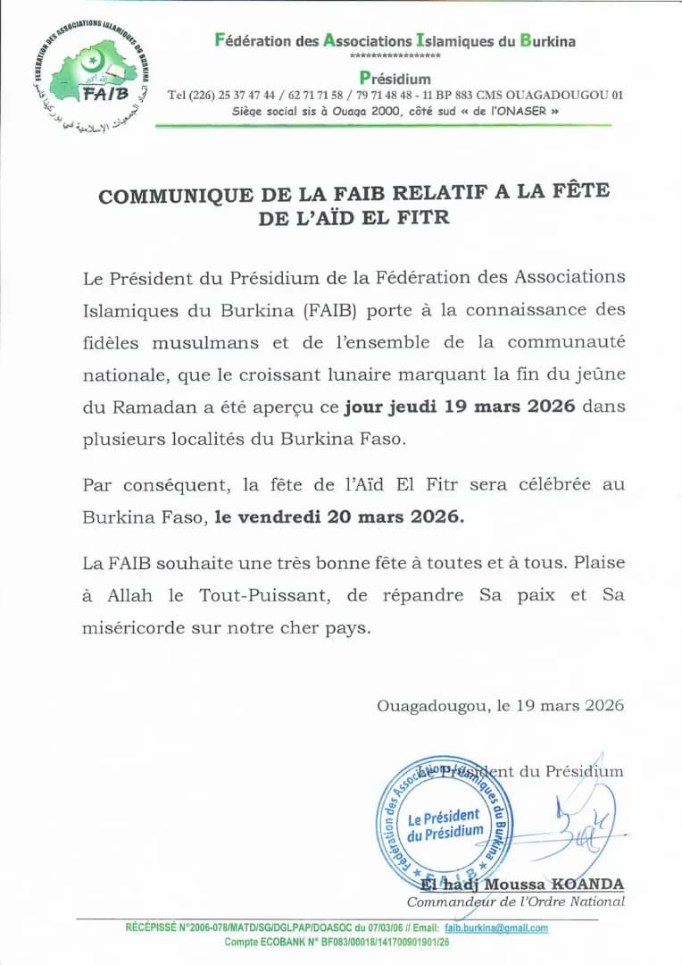 Actualité Annonces-Communiqués Coutume et religion Ramadan : Communiqué FAIB Réveil info 19 mars 2026 Continue Reading Previous Previous post: Burkina : Paul Daumont est devenu ambassadeur de IAMGOLD EssakaneNext Next post: Niger-affaire Bazoum -UE: La confédération AES indignée ( communiqué du président) Laisser un commentaire Annuler la réponseVotre adresse e-mail ne sera pas publiée. Les champs obligatoires sont indiqués avec *Commentaire * Nom * E-mail * Site web Enregistrer mon nom, mon e-mail et mon site dans le navigateur pour mon prochain commentaire. Articles connexes Niger-affaire Bazoum -UE: La confédération AES indignée ( communiqué du président) 19 mars 2026 Les grands dossiers du Conseil des ministres de ce jeudi 19 mars 2026 19 mars 2026