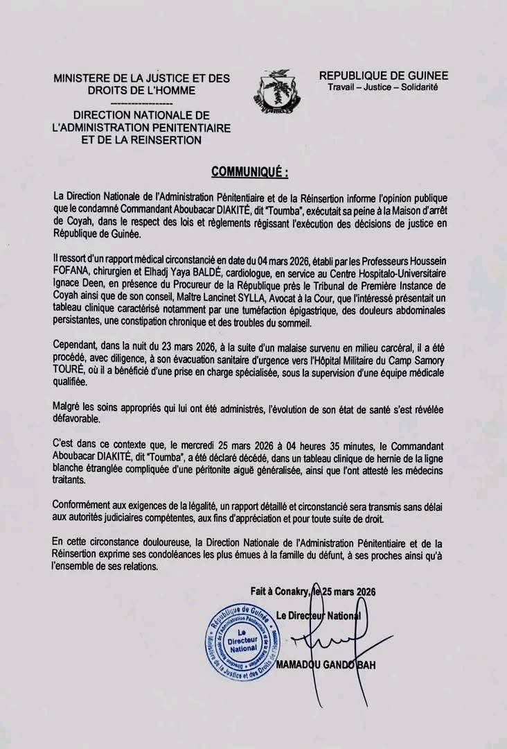 Actualité International Guinée : la mort de Toumba Diakité confirmée Réveil info 25 mars 2026 Continue Reading Previous Previous post: Nécrologie : Remerciements et annonce de Doua de BIG ZNext Next post: CAN Maroc 2025: le TAS confirme l’appel du Sénégal ( voir communiqué TAS) Laisser un commentaire Annuler la réponseVotre adresse e-mail ne sera pas publiée. Les champs obligatoires sont indiqués avec *Commentaire * Nom * E-mail * Site web Enregistrer mon nom, mon e-mail et mon site dans le navigateur pour mon prochain commentaire. Articles connexes CAN Maroc 2025: le TAS confirme l’appel du Sénégal ( voir communiqué TAS) 25 mars 2026 Nécrologie : Remerciements et annonce de Doua de BIG Z 25 mars 2026