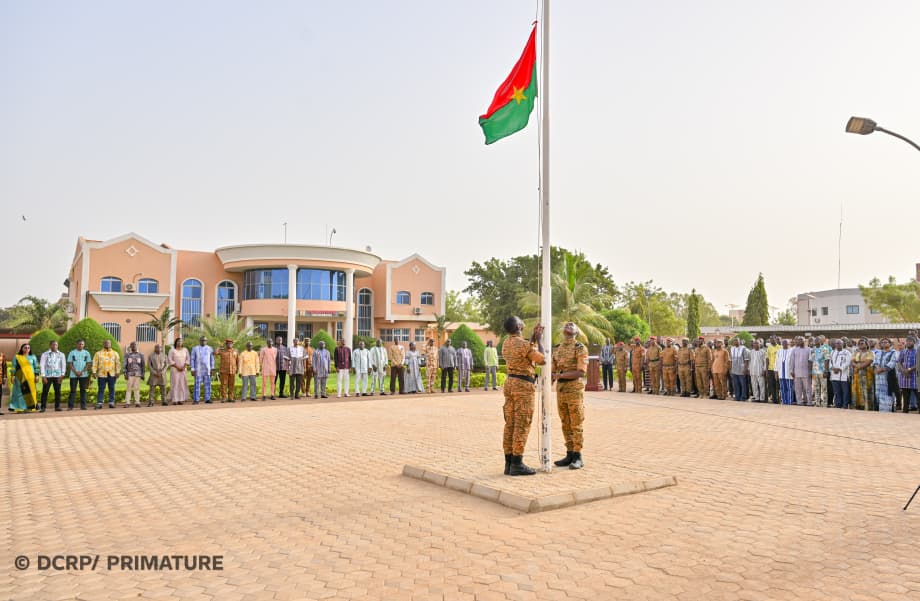 Dans le cadre de la première phase de la 3ᵉ édition des Journées nationales d’engagement patriotique et de participation citoyenne (JEPPC) 2026, une cérémonie de montée des couleurs nationales s’est tenue ce jeudi 26 mars 2026 à la Primature, sous la présidence du Premier ministre, Rimtalba Jean Emmanuel Ouédraogo. À cette occasion, le Chef du Gouvernement a délivré le message du Président du Faso, le Capitaine Ibrahim Traoré, marquant ainsi le lancement officiel des activités prévues du 26 mars au 9 avril 2026 sur toute l’étendue du territoire national ainsi que dans les représentations diplomatiques du Burkina Faso à l’étranger.