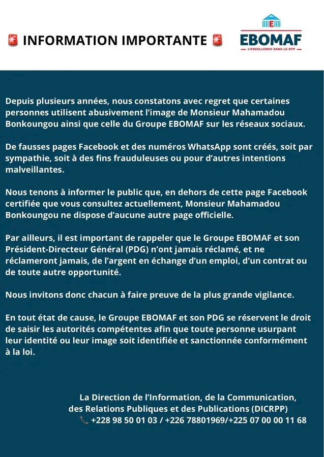 Depuis plusieurs années, nous constatons avec regret que certaines personnes utilisent abusivement l’image de Monsieur Mahamadou Bonkoungou ainsi que celle du Groupe Ebomaf Officiel sur les réseaux sociaux.