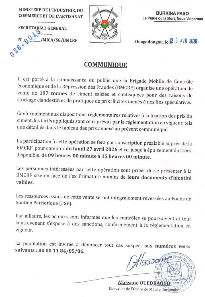 Annonces-Communiqués Communiqué BMCRF : vente de 197 tonnes ciment saisies et confisquées Réveil info 23 avril 2026 Continue Reading Previous Previous post: Le président IB à Bobo : les remerciements de la chefferie traditionnelle et coutumièreNext Next post: Tour international cyclisme féminin Yennega 2026: l’équipe du Cameroun remercie le Burkina Faso Laisser un commentaire Annuler la réponseVotre adresse e-mail ne sera pas publiée. Les champs obligatoires sont indiqués avec *Commentaire * Nom * E-mail * Site web Enregistrer mon nom, mon e-mail et mon site dans le navigateur pour mon prochain commentaire. Articles connexes BOBO : le président IB va présider un conseil des ministres délocalisé 22 avril 2026 Nécrologie: communiqué de remerciements 21 avril 2026