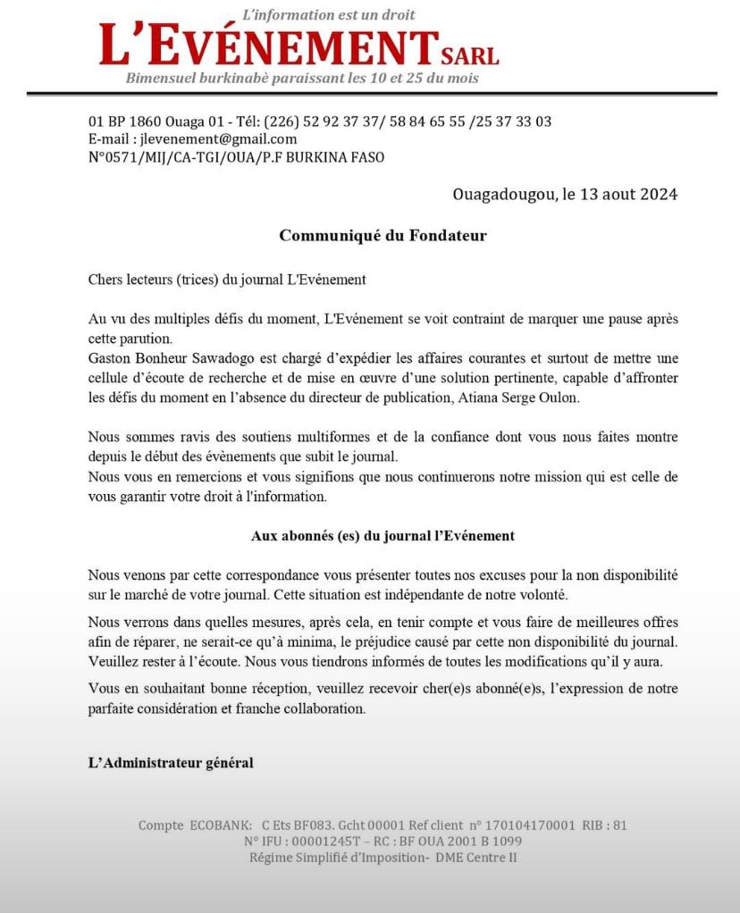 Actualité Communiqué du Fondateur du journal l’Evènement Réveil info 14 août 2024 Continue Reading Previous Previous post: Communiqué Sonabel: Ouverture des vannes du barrage de BagréNext Next post: A la découverte du Monténégro Ou la montagne noire Laisser un commentaire Annuler la réponseVotre adresse e-mail ne sera pas publiée. Les champs obligatoires sont indiqués avec *Commentaire * Nom * E-mail * Site web Enregistrer mon nom, mon e-mail et mon site dans le navigateur pour mon prochain commentaire. Articles connexes Santé : la prouesse des médecins Burkinabè 5 février 2026 Mali: l’échec du terroriste iyad Ag ghaly 5 février 2026