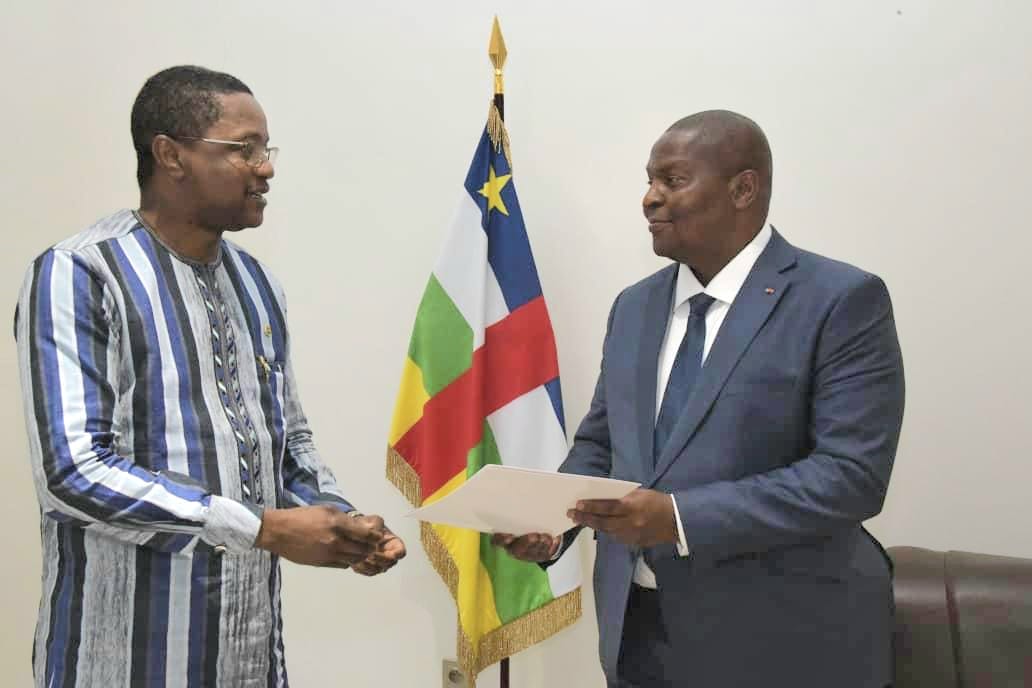 SEM Karamoko Jean Marie TRAORE a saisi l’occasion, pour présenter au Chef d’Etat Centrafricain, la candidature du Burkina Faso au poste de Directeur Général de l’Agence pour la Sécurité de la Navigation aérienne en Afrique et à Madagascar (ASECNA).