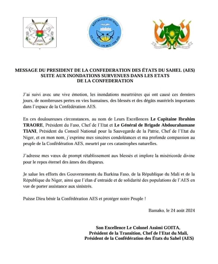 Actualité Annonces-Communiqués Inondations dans les pays AES: message du président de l’AES Réveil info 25 août 2024 Message du président de l’AES,le président Assimi Goita suite aux inondations dans l’AES Continue Reading Previous Previous post: Afrique de l’Ouest: le port de Lomé toujours le maillot JauneNext Next post: Togo: recensement national de l’agriculture Laisser un commentaire Annuler la réponseVotre adresse e-mail ne sera pas publiée. Les champs obligatoires sont indiqués avec *Commentaire * Nom * E-mail * Site web Enregistrer mon nom, mon e-mail et mon site dans le navigateur pour mon prochain commentaire. Articles connexes Grand prix cycliste RTB: la RTB chez le Mogho Naaba 3 février 2026 Ghana : le Co-fondateur de Ecobank et la compagnie aérienne Asky honoré 3 février 2026
