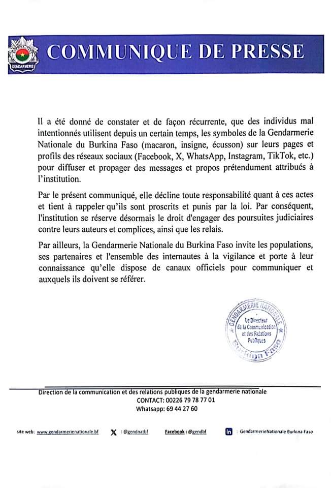Annonces-Communiqués Communiqué de presse de la Gendarmerie Nationale Réveil info 30 août 2024 A ne pas négliger !!! Continue Reading Previous Previous post: Visite du PM au BBDA: son message aux artistesNext Next post: Le Groupe Ebomaf étend ses tentacules dans le domaine maritime au Gabon Laisser un commentaire Annuler la réponseVotre adresse e-mail ne sera pas publiée. Les champs obligatoires sont indiqués avec *Commentaire * Nom * E-mail * Site web Enregistrer mon nom, mon e-mail et mon site dans le navigateur pour mon prochain commentaire. Articles connexes FASO MEBO- Bilan contributions par région : plus de 45 millions pour le Kadiogo 1 février 2026 Dissolution des partis politiques : Réaction de l’ex -CDP 31 janvier 2026