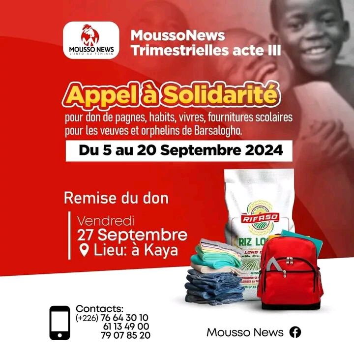 Annonces-Communiqués Appel à Solidarité Réveil info 4 septembre 2024 Continue Reading Previous Previous post: La Plateforme « eSIAO » officiellement lancéeNext Next post: Sénégal: fin de fonction pour deux cadres Laisser un commentaire Annuler la réponseVotre adresse e-mail ne sera pas publiée. Les champs obligatoires sont indiqués avec *Commentaire * Nom * E-mail * Site web Enregistrer mon nom, mon e-mail et mon site dans le navigateur pour mon prochain commentaire. Articles connexes FASO MEBO- Bilan contributions par région : plus de 45 millions pour le Kadiogo 1 février 2026 Dissolution des partis politiques : Réaction de l’ex -CDP 31 janvier 2026